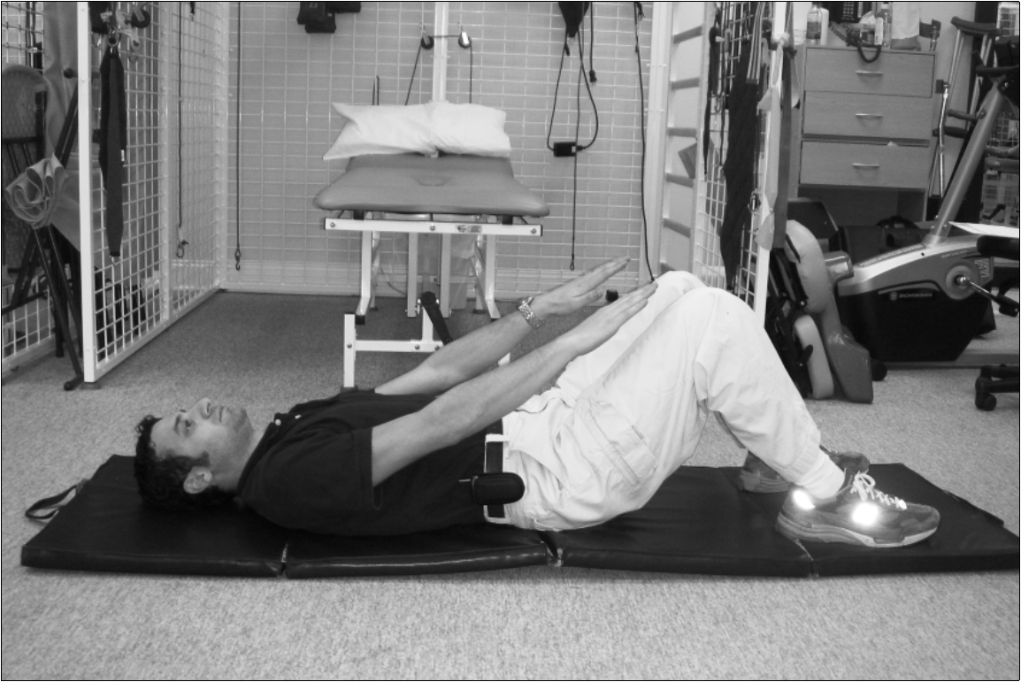Ending position: Alternatively raising opposite legs, holding 3 to 5 seconds. Patient can have cuff weight on his/her ankles.