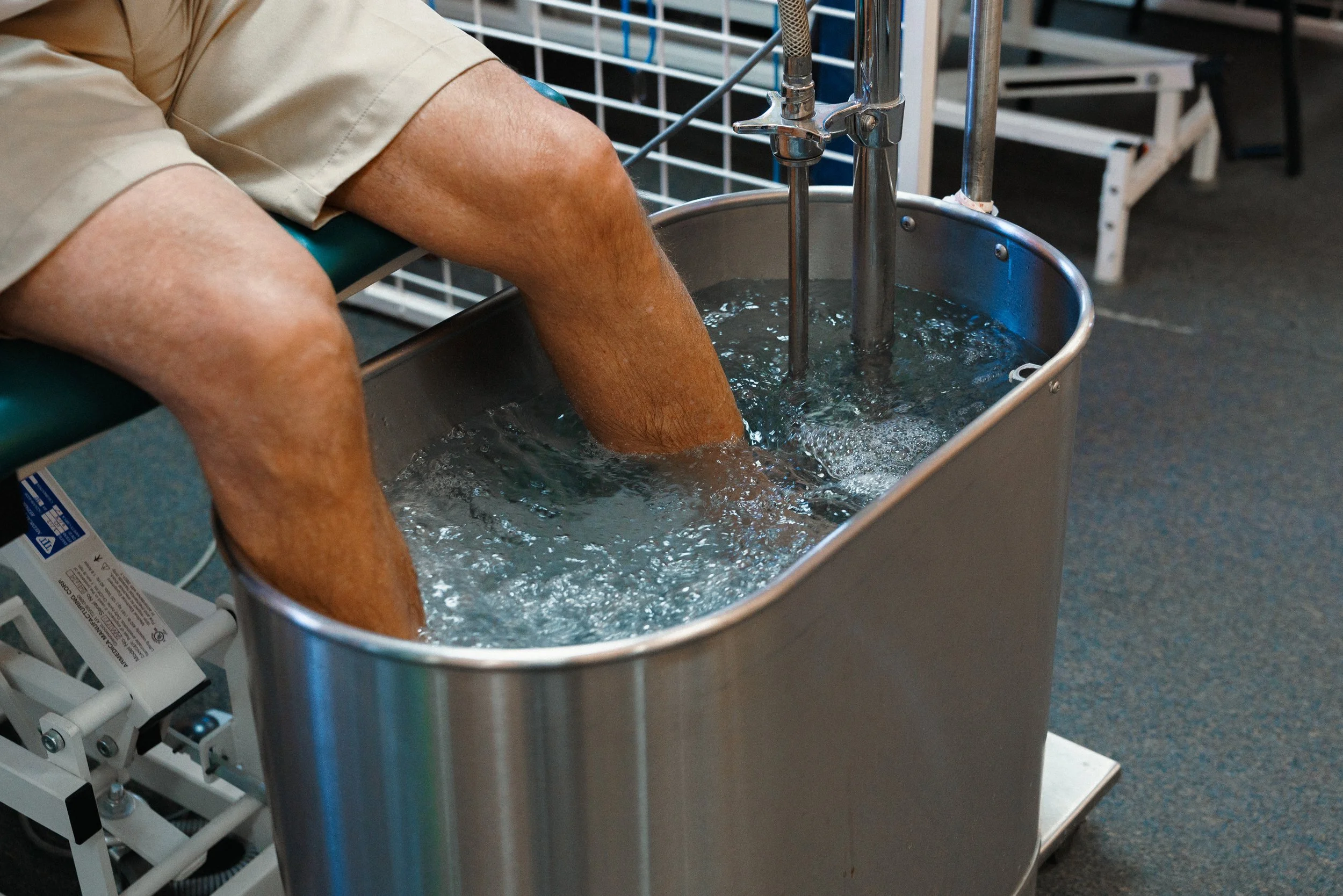 Physical Therapist Tomasz Grass repositions the fubula over the tibia to restore full range of motion after the patient sustained an ankle sprain.